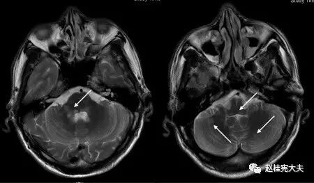 图2. 示双侧桥臂、延髓、小脑多发圆形或卵圆形病灶,T2高信号。