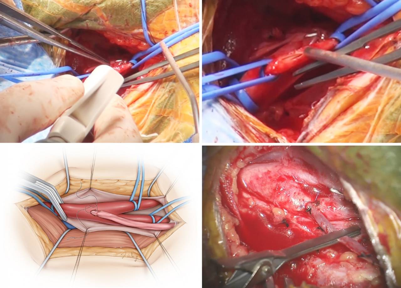 无菌油墨笔标记供血动脉的造口处,“鱼嘴样”扩大桥血管断端增加吻合口面积,随后使用7-0的尼龙线进行端-端吻合。结扎最后一针之前,在吻合口远端的桥血管放置一枚临时阻断夹并用肝素盐水充分灌洗管腔。