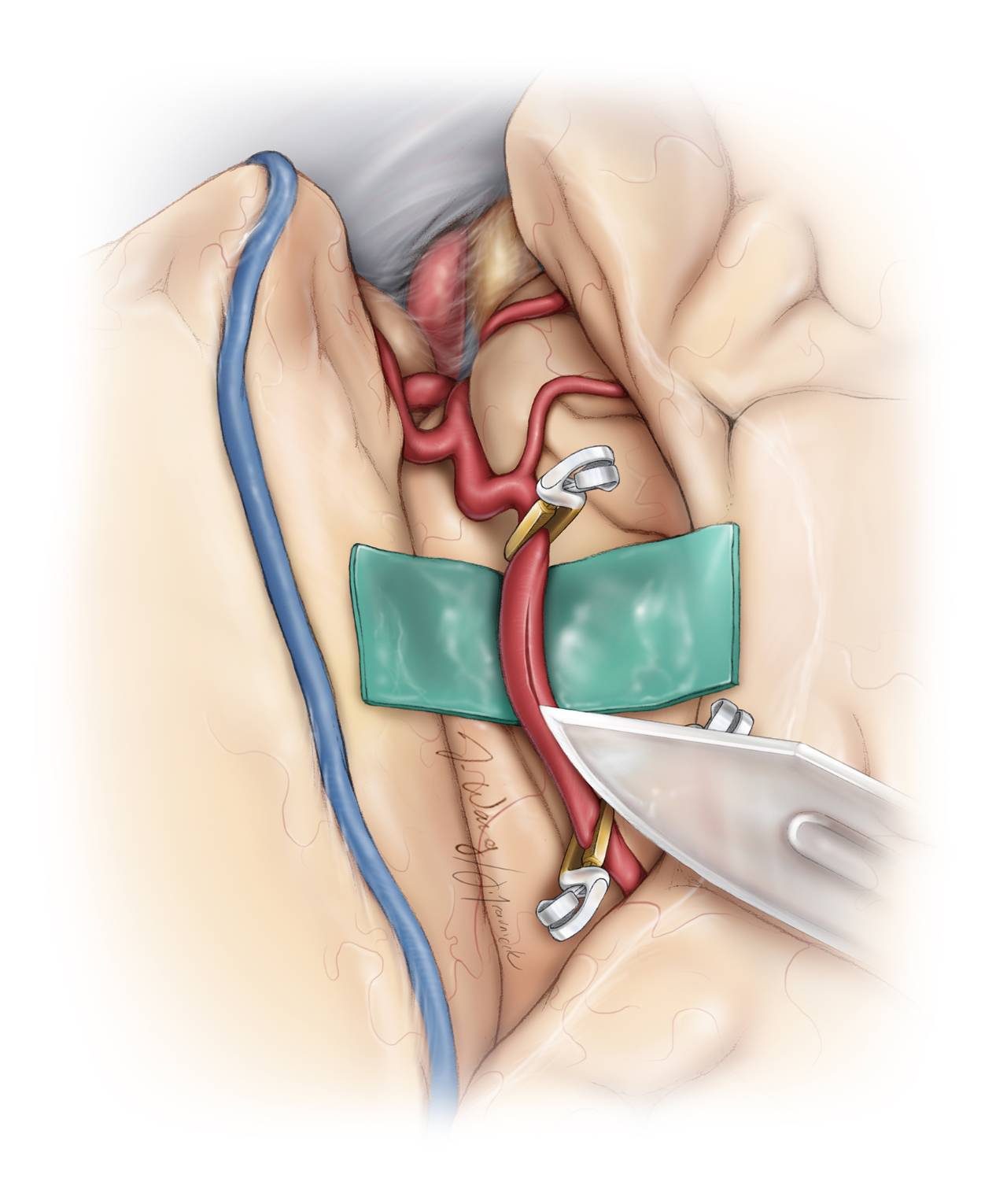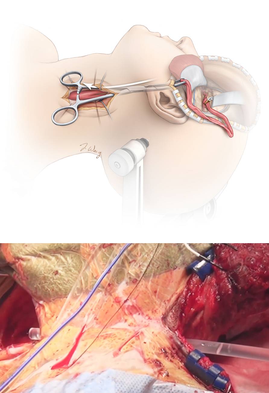 面总静脉位于下端,可被结扎剪断增加CCA、ICA和ECA的显露。使用控制带分别套住这些动脉,每一根血管都应游离出距颈总动脉分叉处4cm的长度以便放置阻断夹、吻合时有足够的操作空间。推荐使用ECA作为近端的吻合部位,这样可避免临时阻断ICA的需要。但如果ECA的解剖走形会造成桥血管扭转,则改用ICA。