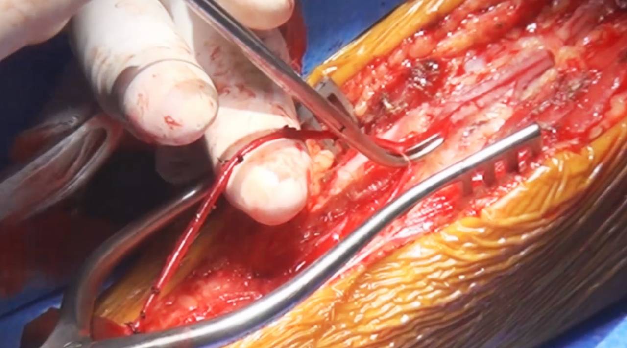 图4. 笔者偏好使用桡动脉。仔细分离、结扎该动脉的小分支,避免损伤主干。获取一段合适长度的桥血管并实现无张力吻合至关重要。该步骤由外周血管外科医师完成,个中细节这里不再详细论述。取得桥血管后,肝素盐水灌洗、膨胀管腔(压力扩张技术)。