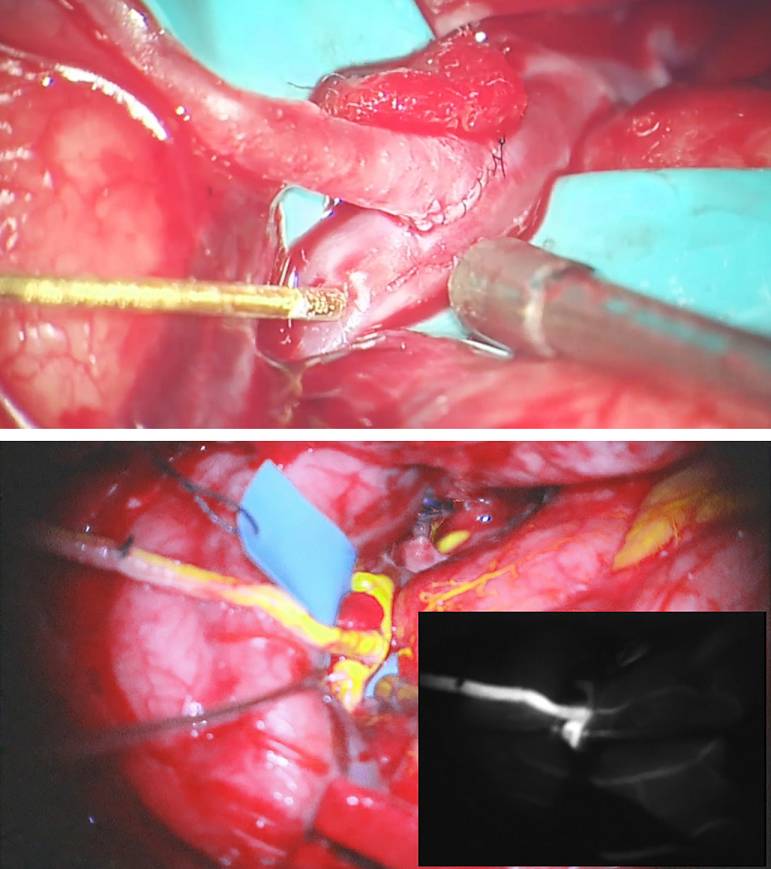 图10. 微型超声多普勒探测血流(上图)。创伤小和实施迅速的荧光或吲哚菁绿(ICG)造影是术中评价搭桥通畅性的可靠手段(下图)。荧光血管造影简单易行,能够发现血流不足、狭窄或闭塞的部位。