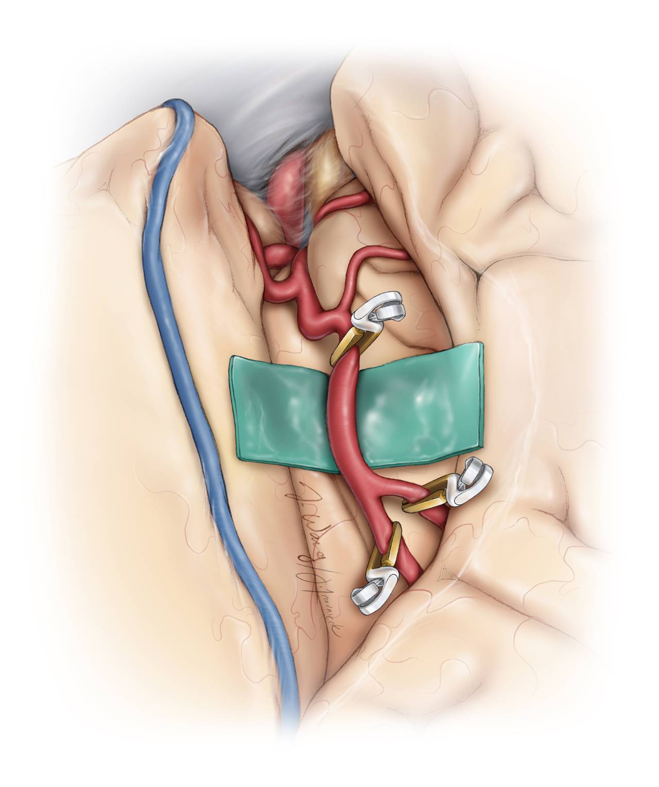 图5. 术区彻底止血。在受血动脉下方垫入一块带颜色的对照物(橡胶垫片)映衬透明的血管管壁,同时保护深面的脑组织。术中需要肝素盐水不断冲洗术区,在橡胶垫片下方留置一根具有持续吸引作用的引流管可以使吻合部位保持干燥。