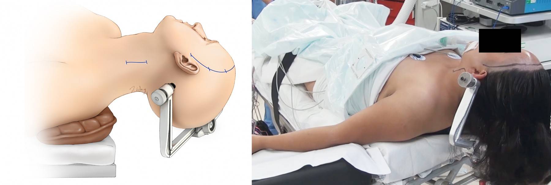 图3. 依据供血、受血动脉的位置和计划分离桥血管的部位来调整患者的体位。沿胸锁乳突肌前缘做一道5cm的切口暴露颈部的ICA和ECA。同时进行颈部解剖、开颅和取桥血管可以加快手术进程。