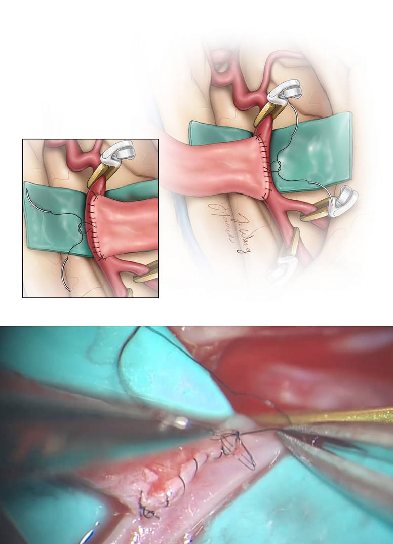STA-MCA搭桥应用最为广泛,在“低流量搭桥”一章中已详细阐述。IC-IC原位吻合属于低流量搭桥,特别适合大脑前动脉(A3-A3搭桥)和小脑后下动脉(PICA-PICA搭桥)的复杂动脉瘤,该技术的优点为所吻合的两根血管管径相近、桥血管就位于颅内且所需长度短。