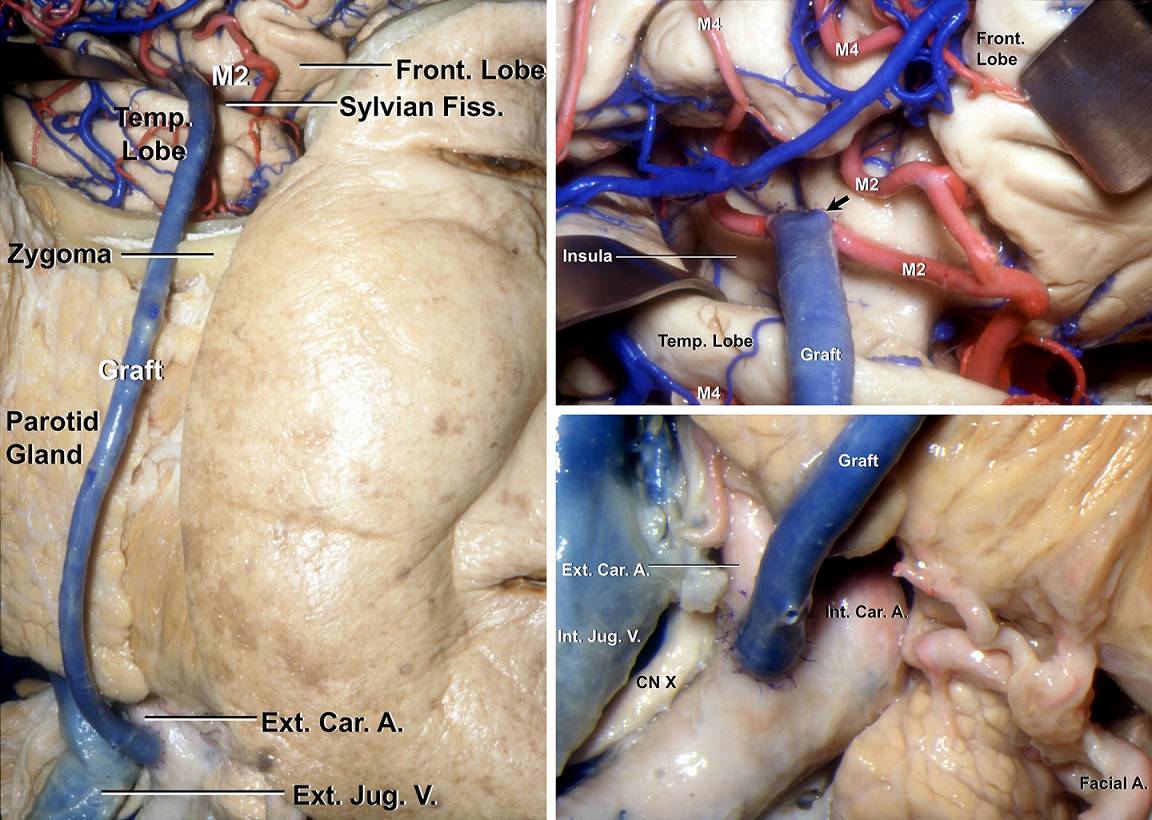 图2. 尸头标本演示使用静脉进行ECA/ICA-M2高流量搭桥。颧弓上钻一沟槽容纳桥血管无缠结地通过;在豆纹动脉远端选取一段分支最少的M2作为受血动脉临时阻断,采用端-侧吻合的方式以8-0或9-0的尼龙线间断缝合远端吻合口(右上图的箭头);随后完全阻断颈部的ICA或ECA,使用7-0尼龙线,桥血管近端可以端-侧吻合至ICA,也可以端-端吻合至ECA。(图片由AL Rhoton,Jr教授授权)