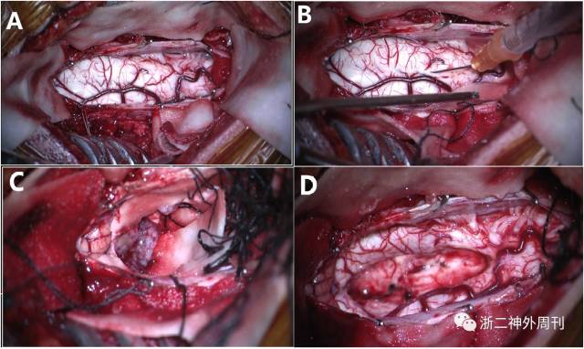 图2. 术中照片,延颈髓明显膨大(图A),切开后正中沟(图B),切除靠近延髓腹侧肿瘤时(图C)出现心率变化,暂停操作后心率恢复正常,肿瘤显微镜下全切(图D)。