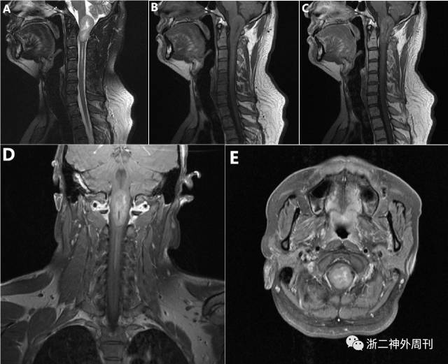 图1. 术前MRI,枕骨大孔区髓内肿块,大小约23.0mmx22.3mmx42.3mm(左右x前后x上下)。T1以等信号为主(图B),T2以稍高信号为主(图A),内见不规则裂隙状坏死区;增强后(图C-E)坏死周围呈花环样强化,外围中等强化,肿块下方脊髓中央管局段性扩张。