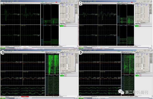 图3. 术中电生理监测,双上肢及双下肢运动诱发电位(MEP)在术前(图A)及肿瘤全切后(图B)均可引出;感觉诱发电位(SEP),术前(图C)及肿瘤全切后(图D)双上肢均未引出,双下肢在术前术后均可引出,无明显异常。