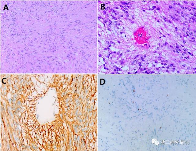 图5. 术后病理为室管膜瘤(WHO II级)。图A,中等细胞密度肿瘤,细胞胞浆呈纤维胶原状(HE染色 20x倍);图B,胞浆突起,聚集在小血管周围,细胞核位于周围,形成假菊形团(HE染色 40x倍);图C,GFAP(神经胶质酸性蛋白)标记室管膜瘤细胞胞浆,血管周围无核区,呈纤维放射假纤维菊形团状;图D,Ki-67增殖指<1%。
