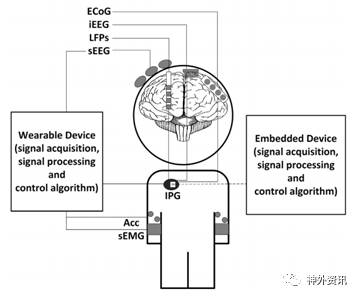 图1. aDBS系统模式图。sEEG:体表脑电图;iEEG:颅内脑电图;LFP:局部场电位;Acc:加速度传感器;sEMG:体表肌电图;ECoG:皮质脑电图;IPG:植入式脉冲发生器。