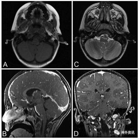 图1. MRI提示斜坡区一肿物。A.TI加权平扫;C.T2加权平扫;B和D.T1加权增强。