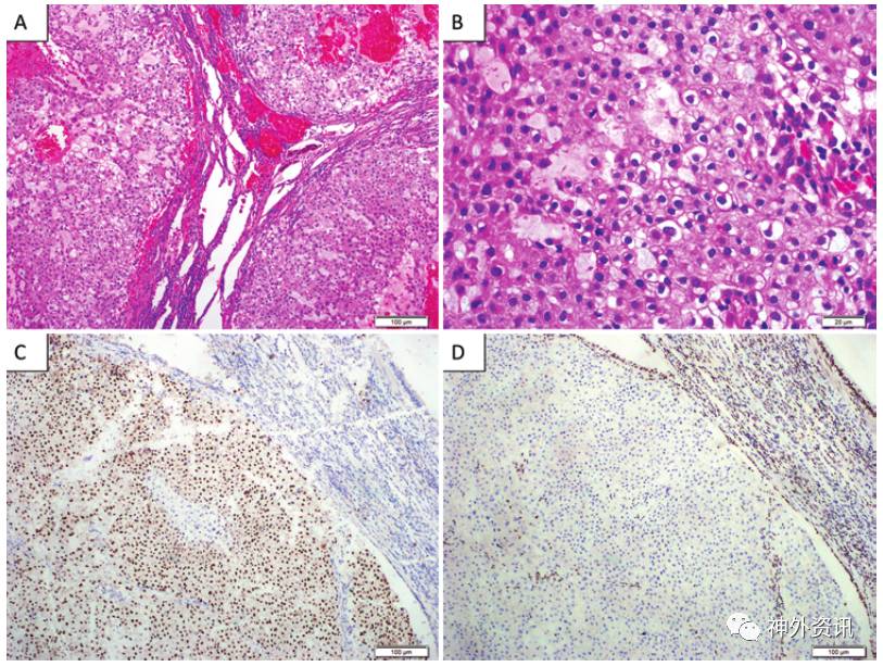 图3. 斜坡脊索瘤病理学检查结果。A.H-E染色显示背景呈嗜碱黏液状,肿物由肿瘤上皮细胞组成,胞质中有泡沫样液泡,异型性较小,分裂不活跃。免疫组化提示角蛋白强阳性(B)、上皮膜抗原强阳性(C)和S-100免疫反应阴性(D)。