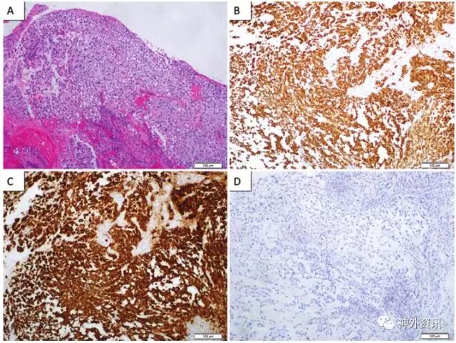 图5. 肺部转移瘤的病理学检查结果。A和B.H-E染色显示低分化的上皮肿瘤细胞,核深染,分裂活跃;C.鼠短尾突变体反应强阳性;D.INI-1反应阴性。