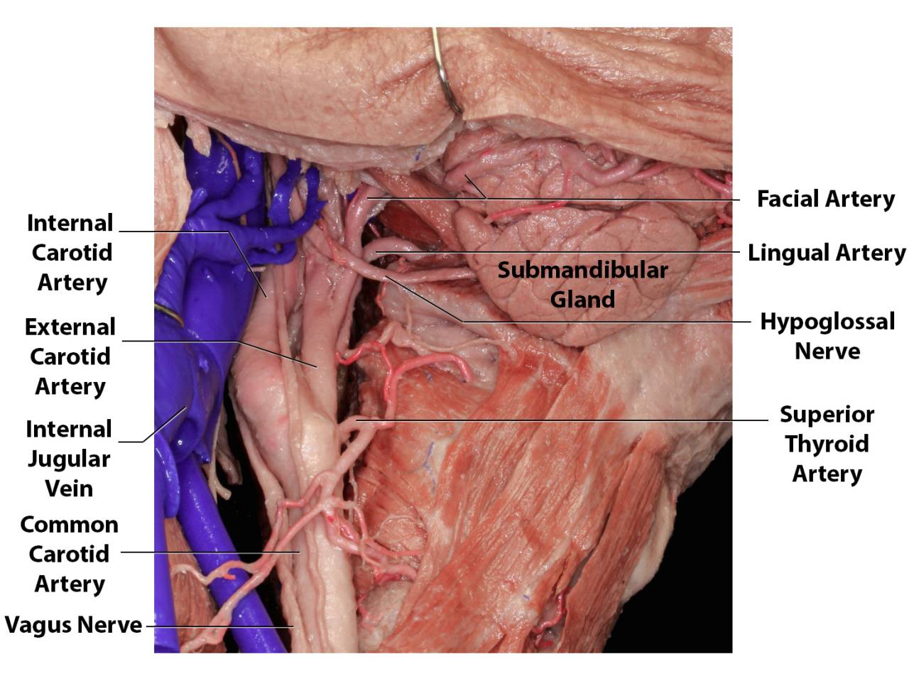 颈外动脉及其分支的解剖关系是达到合适显露的一个关键标志。颈外动脉起于颈总动脉并位于甲状软骨上缘的外侧。颈外动脉有8个分支,甲状腺上动脉是其第一个分支,舌动脉和面动脉起自颈外动脉的前壁。颈外动脉后壁发出枕动脉和耳后动脉,而咽升动脉起自其内壁。颈外动脉在下颌颈水平移行为两个终末支进入腮腺:分别是上颌动脉和颞浅动脉。