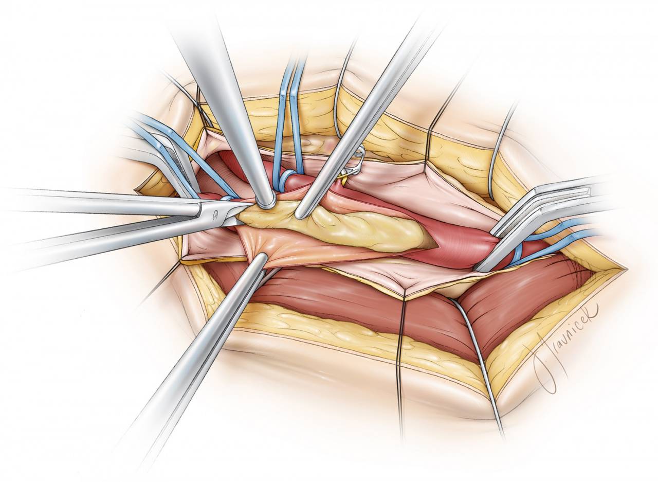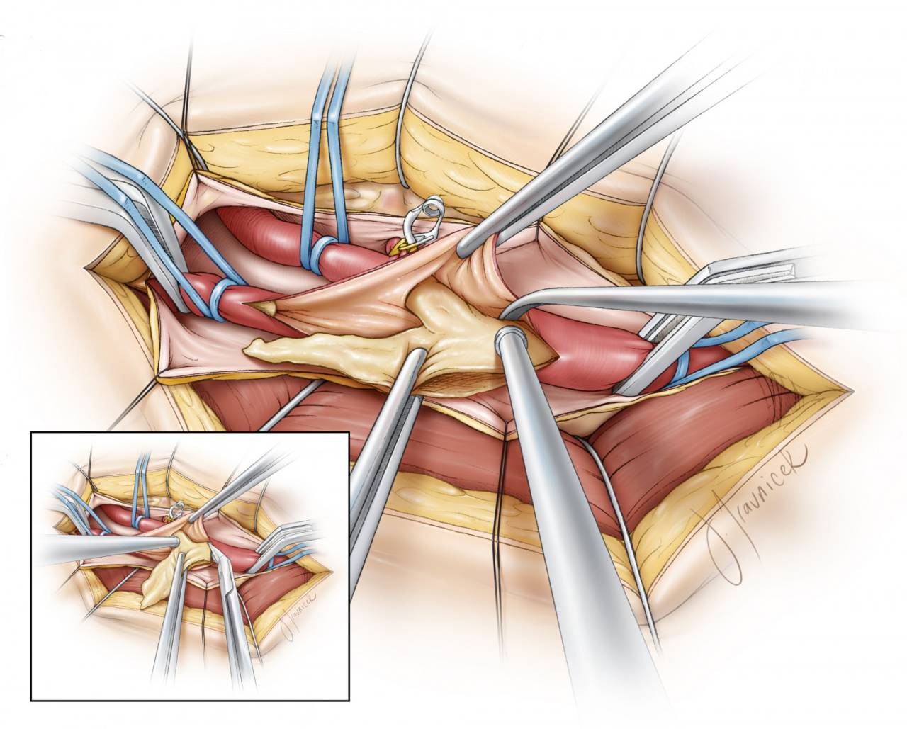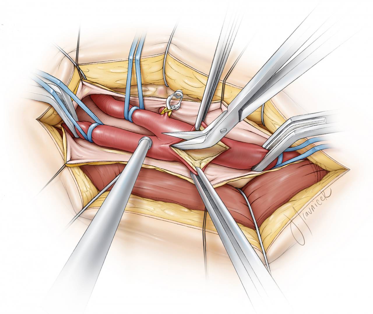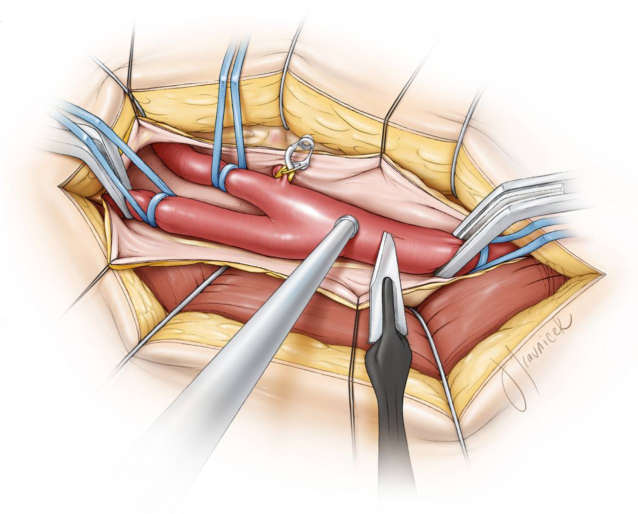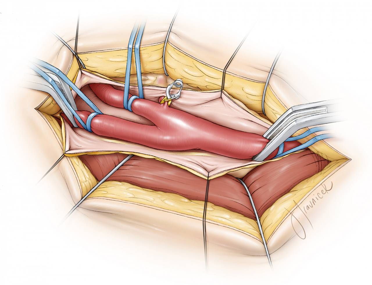 简单地显露颈动脉的主要三段是不够的。一旦它们的上表面游离,重要的是CCA,ICA,ECA环形游离。环形分离能使术者有机会旋转动脉(如果需要)以更好一些的角度来切开动脉。这样的游离也允许夹闭时牵引血管,确保血管完整的被阻断夹夹闭和血管圈套带环形包绕,同时不会误将包括迷走神经在内的其他结构包绕在内导致损伤。