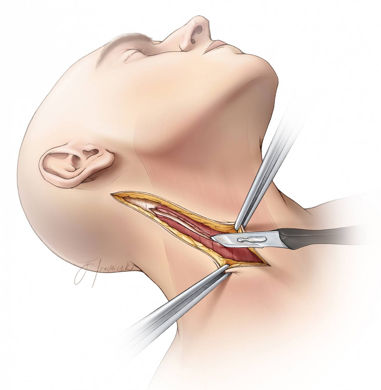 应该通过体表标志估计分叉的位置和必须显露的范围(根据斑块的位置和长度)。甲状软骨大约在C4-5水平。几乎所有的分叉都位于甲状软骨之上,因此切口应该超过甲状软骨。下颌角和舌骨大约在C3,下牙代表C2水平。