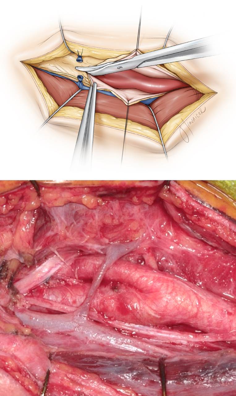 术中有三根神经特别重要。舌下神经在分离的远端跨过颈内动脉且必须被保留。舌下神经损伤是CEA手术中最常见的神经损伤。当颈动脉分叉过于靠近颅底时,舌下神经损伤风险就增加。舌下神经定位可以通过向上追踪颈袢(由C1-C3发出的神经根组成,译者注)识别,就在颈袢加入舌下神经时即可明确其定位走形。最后,迷走神经走形在颈动脉鞘内,通常沿鞘后外侧壁走形并位于颈动脉和颈内静脉的后方。小心打开颈动脉鞘可轻柔的向外后方松解该神经。