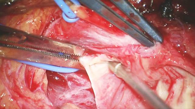 笔者采用剪刀钝性分离颈内静脉和颈动脉之间的软组织平面,向外侧移动颈内静脉,直到颈动脉鞘完全打开。继续采用扁桃体钳钝性分离并进一步游离颈动脉鞘;将颈动脉鞘锐性垂直切开显露下方的颈动脉。
