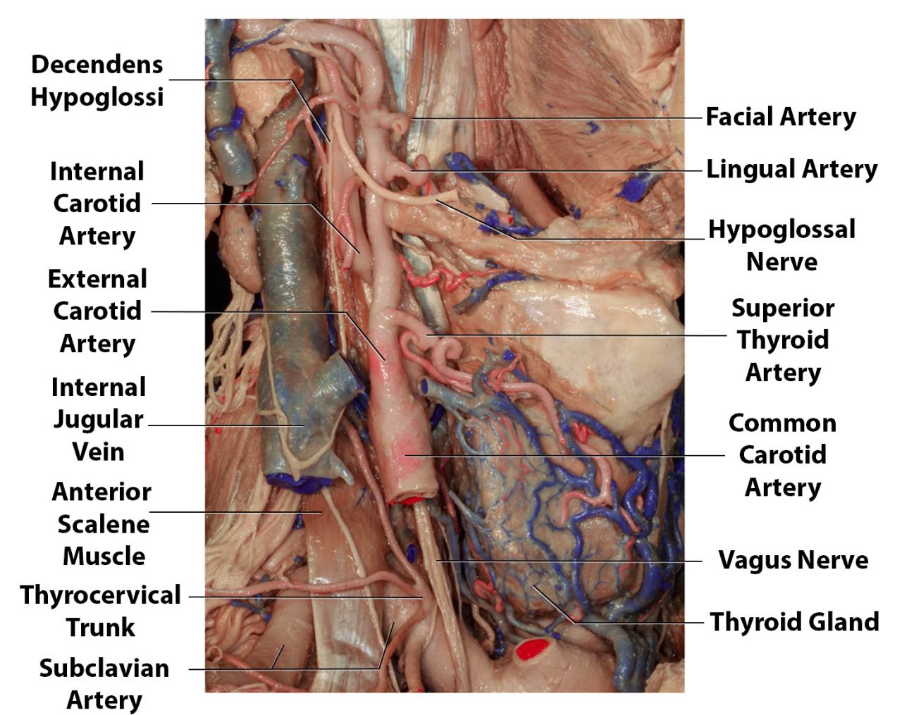 有几个解剖关系可指导分离。首先,颈内静脉位于颈动脉外侧。如果患者头部向对侧旋转的太多,颈内静脉可能会位于颈动脉上方从而阻挡术野。