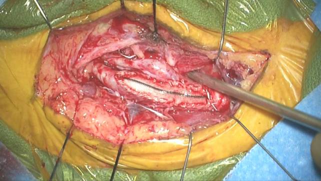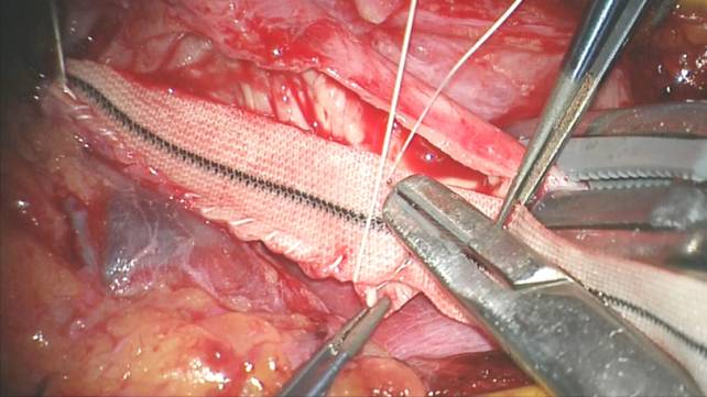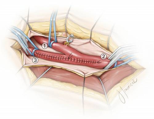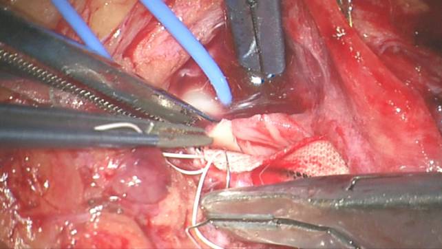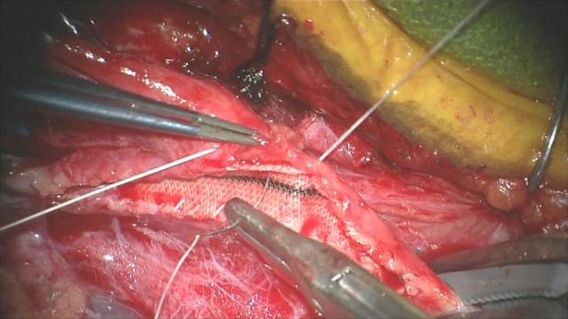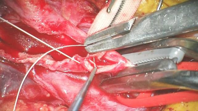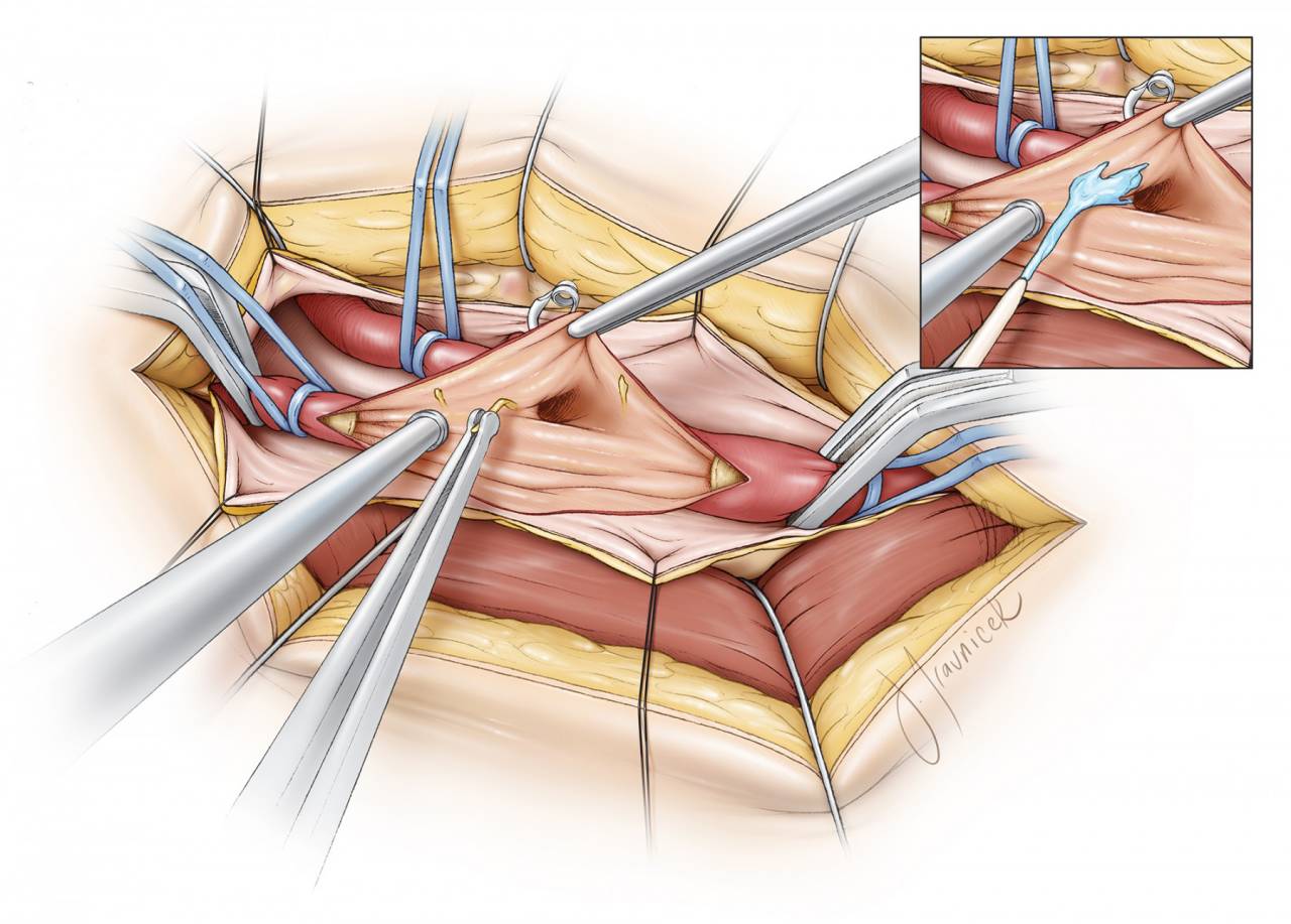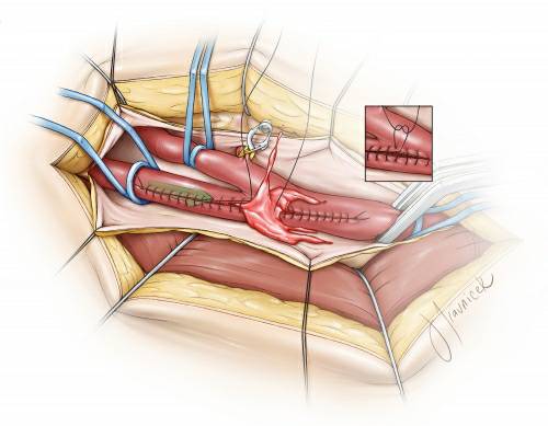 笔者特别注意将动脉的所有层次缝合在一起,并且针脚间距足够的小,这样漏血的的机会最小。另外,不要将外膜瓣缝合到管腔内。