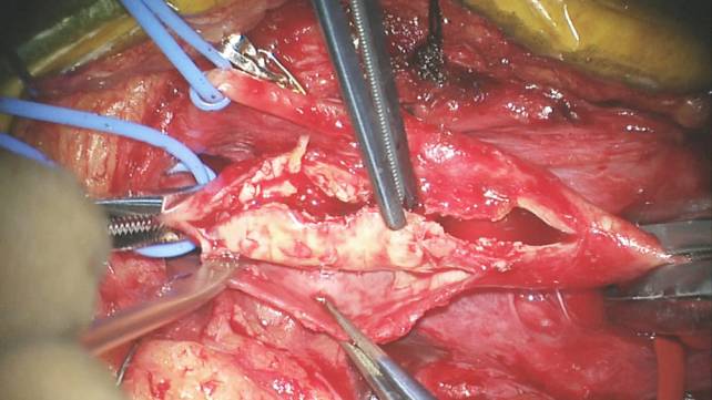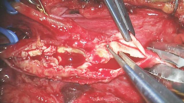 图15. 在斑块远端分离后,笔者继续使用pott’s剪刀离断颈总动脉和斑块近端。一般来说,斑块会向近心端延续,因此必须在动脉切口的下端切断斑块。几乎不可能在颈总动脉内看到一个清晰的斑块像羽毛尖一样逐渐狭小的末端。