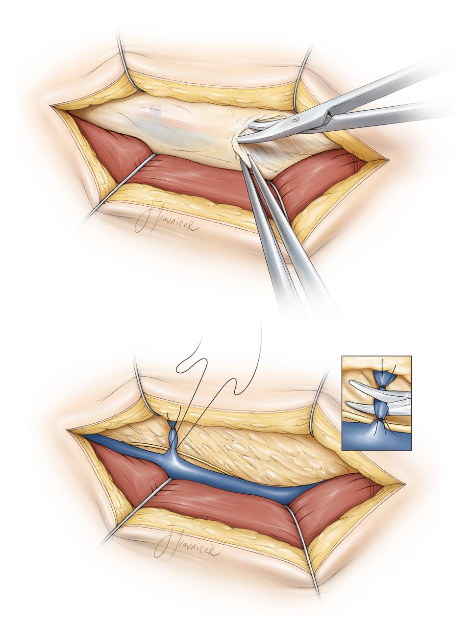 因为剪刀可能无法有效剪开钙化斑块,因此斑块钙化便是一个棘手的问题。在这种情况下,笔者采用11号刀片小心切开斑块。剪刀无法通过的极度狭窄的动脉同样也是难点之一,这时11号刀片也许同样有用。