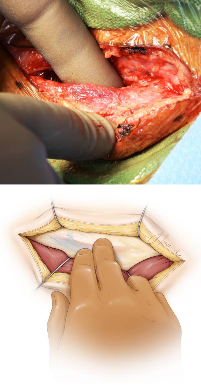 图7. 在轻度外翻及牵拉胸锁乳突肌后,笔者沿着该肌肉内侧面触诊软组织判断颈动脉的搏动和定位。注意触诊的方向仅沿肌肉的内表面(上图)。在胸锁乳突肌和中线吞咽肌群间软组织的分离平面识别颈内静脉。可能需要鱼钩牵开器扩大这个平面,但是要避免鱼钩或者牵开器的叶片伤及喉返神经或者食道(下图)。