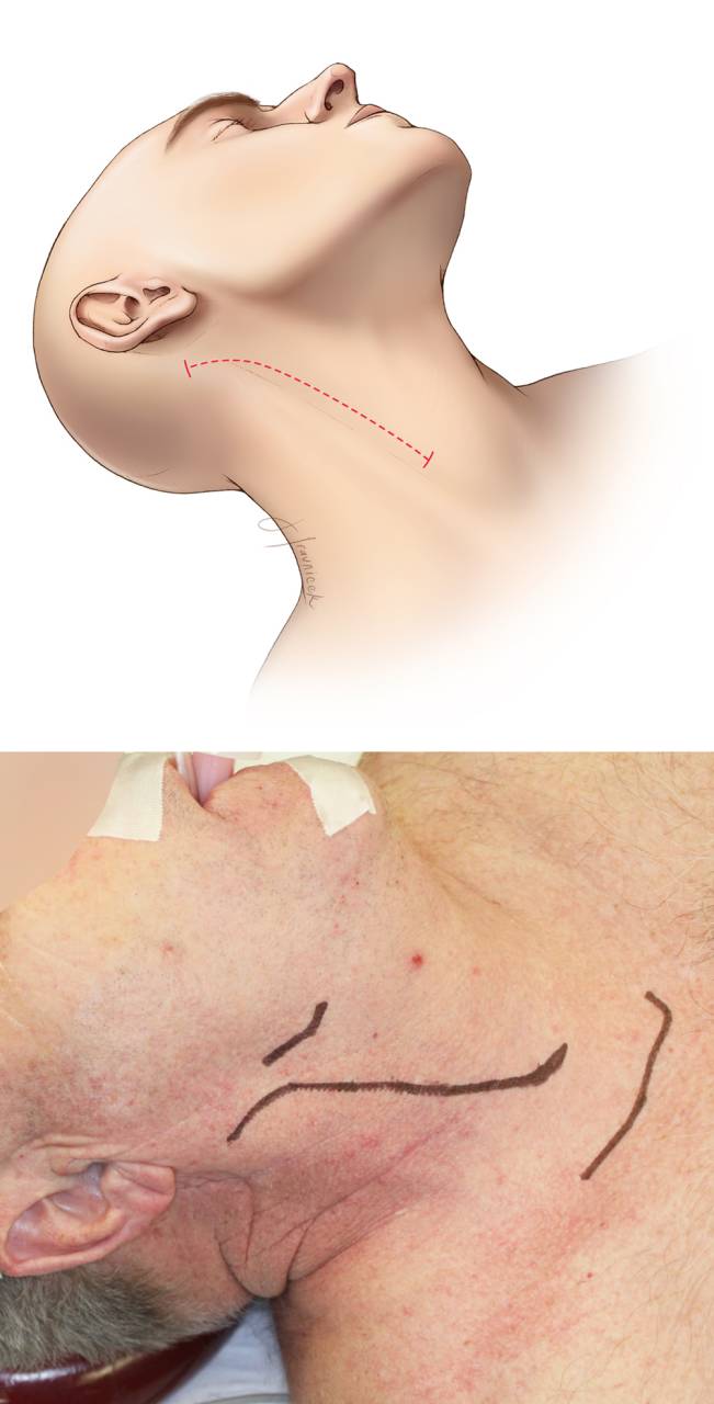 图5:一个纵行切口从恰位于下颌角上延伸至恰位于甲状软骨下,并且沿胸锁乳突肌前缘走形(上图)。切口可以根据分叉的水平扩大向下低至胸骨上切迹,向上高达耳后区。切口应远离下颌角来减少面神经下颌缘支的损伤。标记下颌角和胸骨切迹。注意患者颈部的轻度旋转。