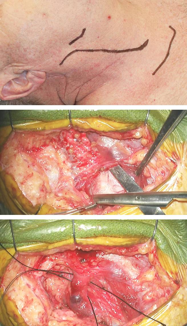 图21a. 显示皮肤切口(上图)和剪刀扩张分离显露颈动脉鞘(中图)。面总静脉被分离后用两根缝线结扎静脉。