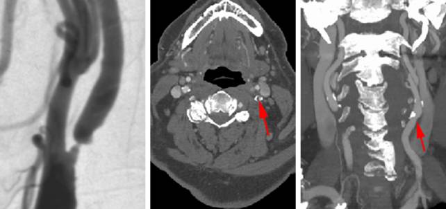 图1. 一例左侧溃疡性、部分钙化的斑块导致颈动脉高度狭窄,术前血管造影(左图)和CTA(右二图箭头)证实。