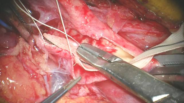 图21f. 颈内动脉管腔狭小提示需要使用补片成形术。在缝针穿过补片和血管壁后折返防止缝合后漏血。