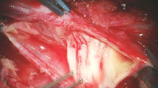 图21b. 斑块的外侧面已经从颈动脉腔内分离。注意主刀和助手的协同移动。
