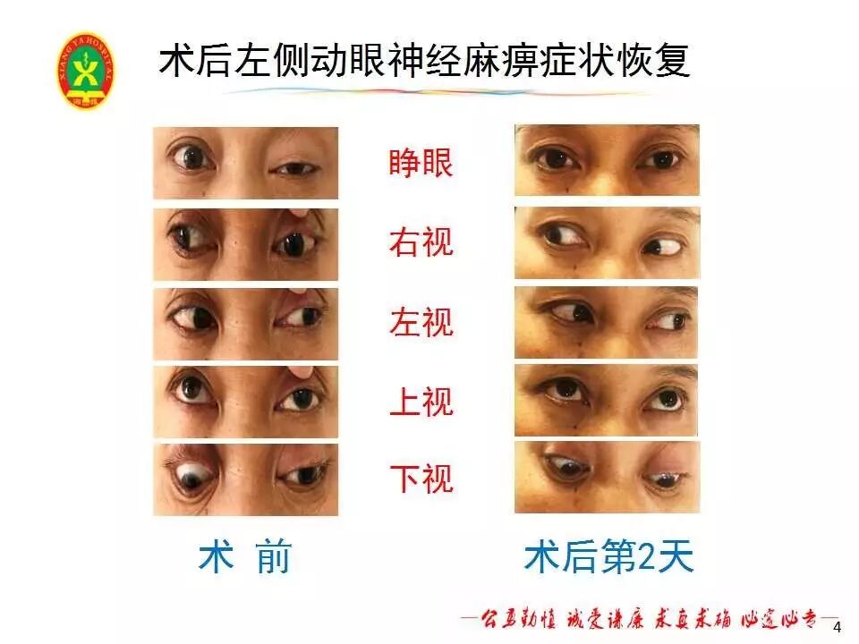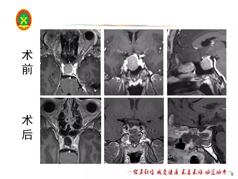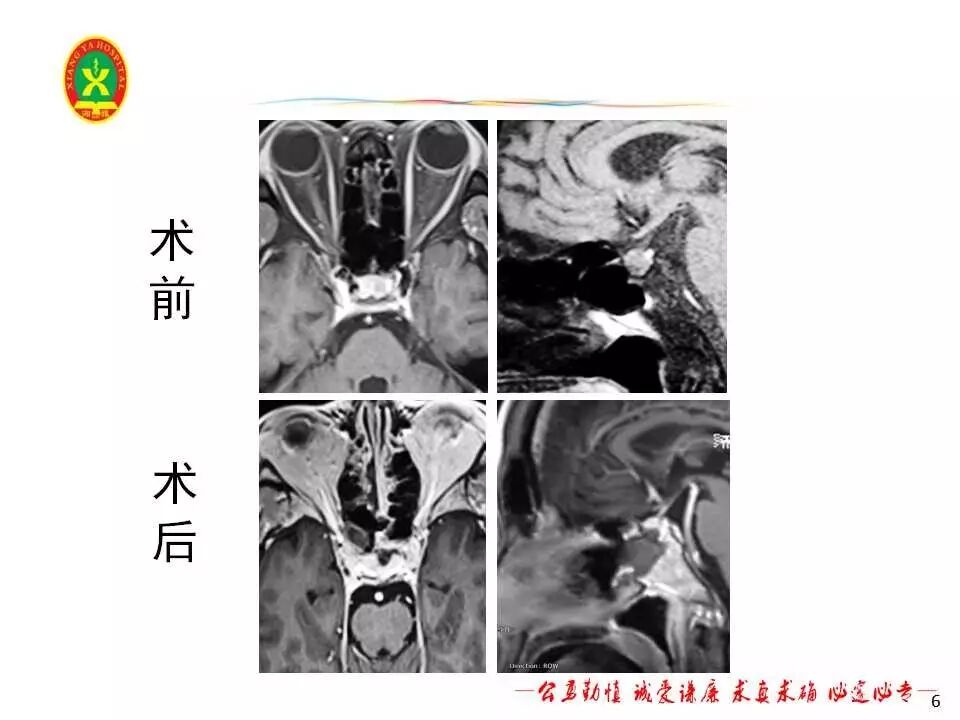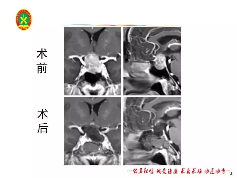 该患者鞍底下陷,肿瘤与双侧颈内动脉关系密切,术中通过对解剖结构的仔细辨别,全切肿瘤。术中合并脑脊液漏,行鞍底重建。患者术后视力较术前改善,左侧动眼神经麻痹症状消失,评估患者垂体激素正常。患者术后出现短暂尿崩,口服去氨加压素片后症状好转,无电解质紊乱,无脑脊液漏。术后MRI提示肿瘤全切,术后第5天出院,嘱患者三个月后我院垂体腺瘤联合门诊复查。