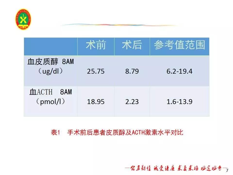 该患者蝶窦解剖结构复杂,鞍底定位有一定难度,在神经导航故障的情况下,凭借丰富的临床经验,准确定位鞍底并暴露肿瘤。术中见肿瘤位于垂体中分,全切肿瘤。患者术后皮质醇、ACTH下降至正常水平(见表1),无脑脊液漏及尿崩,术后MRI提示肿瘤全切,垂体结构保留完好。患者术后第三天出院,嘱患者3个月后我院垂体腺瘤联合门诊复查。