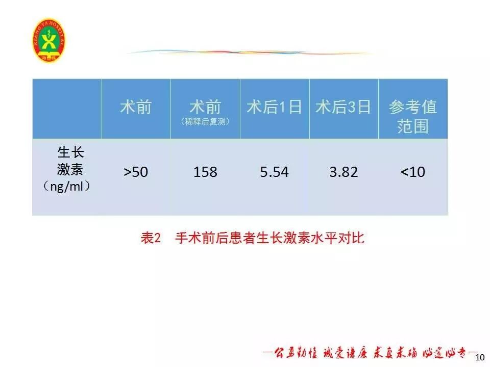 该患者术中见鞍底骨质变薄,部分缺损(约0.5×0.5cm大小),垂体位于肿瘤后上方,术中肿瘤全切。患者术后恢复良好,无脑脊液漏、尿崩及电解质紊乱。术后复查生长激素较术前明显下降(见表2),甲状腺轴及性腺轴正常。术后MRI提示肿瘤全切,垂体结构保留完好。患者术后3天出院,嘱患者3个月后我院垂体腺瘤联合门诊复诊。