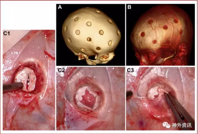 图1. 手术要点:A.术后3D-CT扫描图像,显示双侧额、颞、顶及枕骨区的骨孔;B.术后3月的CTA成像示颞浅动脉管径增粗,分支延伸至颅骨钻孔处与软脑膜相接;C1.三角形骨膜瓣翻向一侧,钻直径1cm的颅骨孔,暴露硬脑膜;C2.打开硬脑膜和软脑膜后可见脑皮质;C3.用钳子将骨膜瓣塞入硬膜下腔。