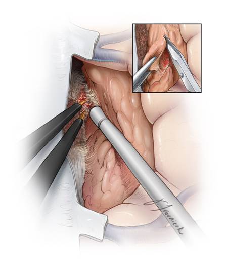 如果软脑膜被侵犯,可利用脑棉“擦除”病变脑组织,并使之远离肿瘤,同时将肿瘤包膜推入术腔(插图)。将脑棉折叠“转动”着置入术腔深处建立一肿瘤与脑组织分隔的界面。重要的血管(胼周动脉及胼缘动脉)可能会与肿瘤粘连,予镜下锐性分离。每一根血管都必须仔细鉴别其是否肿瘤供血动脉,过路血管必须予以保留。