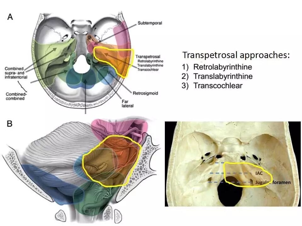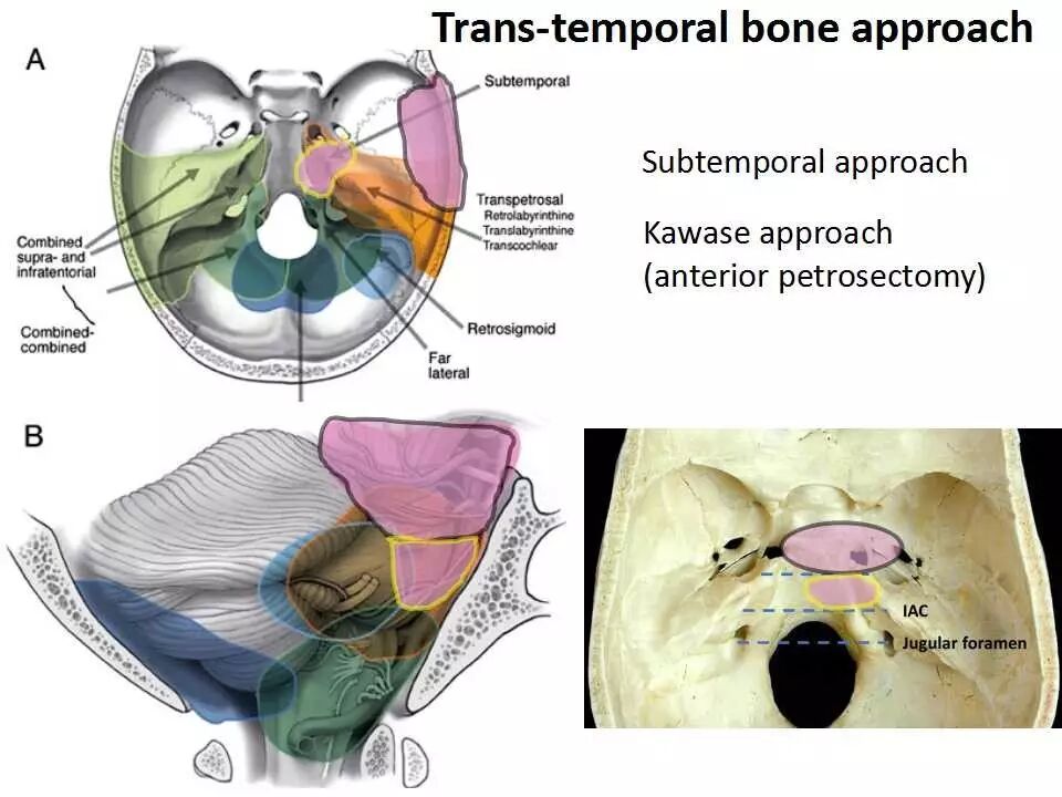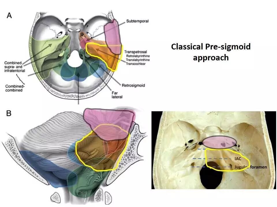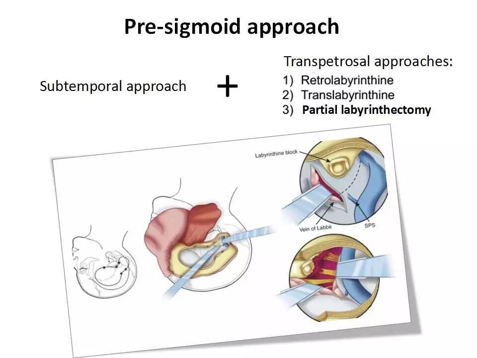 狭义的乙状窦前入路包括乙状窦前迷路后入路、经迷路入路、经耳蜗入路,上述入路根据磨除的岩骨部分不同,处理的病变范围也有所差异,但主要局限于小脑幕下。