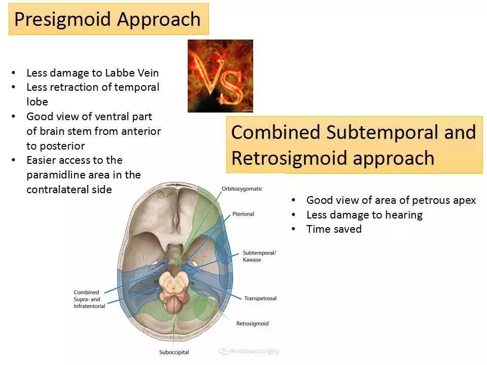 经典乙状窦前入路相较颞下联合乙状窦后入路的开颅方式亦有所区别,前者在避免labbe静脉损伤和减少颞叶牵拉方面具有一定优势,同时还具有从前向后处理脑干腹侧病变特别是对基底跨越中线至对侧病变显露有更好的视野;而后者由于观察角度更靠后,从幕下对岩尖部的观察和操作更有优势,同时避免了听力丧失的可能,并且相对乙状窦前入路,可能会在开颅时间上有一定优势,但在暴露中线特别是中线对侧区域病变的基底存在可能的盲区。