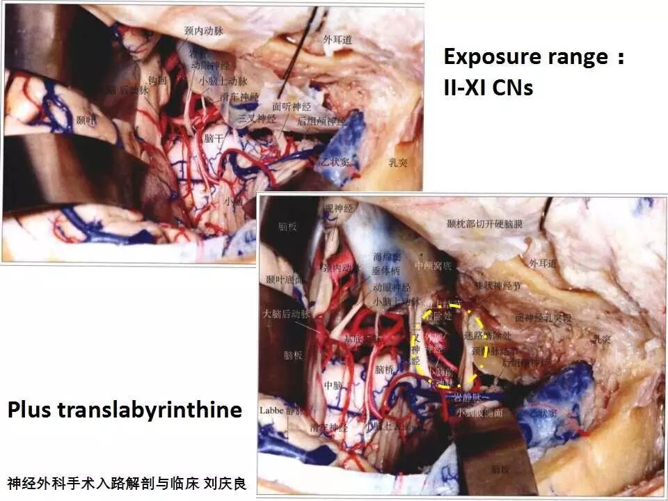 而经典的乙状窦前入路指的是颞下联合狭义乙状窦前的手术入路。由于增加了颞下入路的手术通道,其暴露的范围可以达到从视神经至后组颅神经广泛的中后颅窝及中线斜坡区域,尤其适用于累及中后颅窝又累及中线斜坡甚至中线对侧区域的病变。