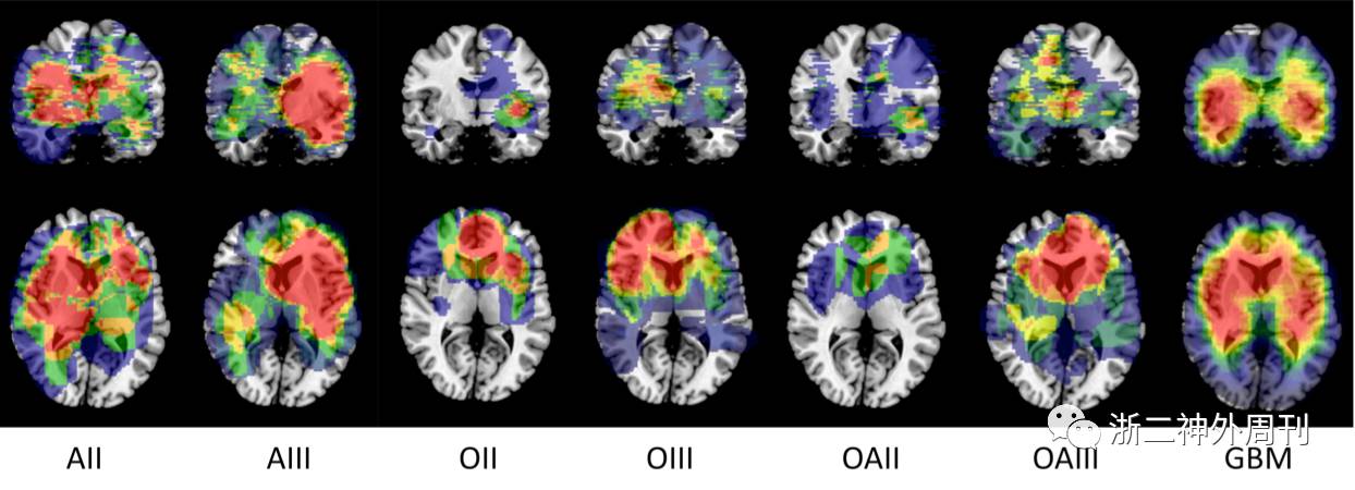 图1. 不同病理类型的胶质瘤的位置分布特征。AII:弥漫性星形细胞瘤,AIII:间变性星形细胞瘤,OII:少突胶质细胞瘤,OIII:间变性少突胶质细胞瘤, OAII:少突星形细胞瘤,OAIII:间变性少突星形细胞瘤,GBM:胶质母细胞瘤。