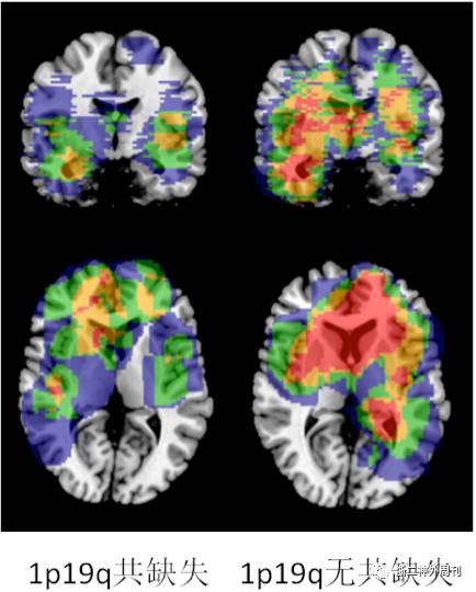 图6. 不同1p19q共缺失状态的肿瘤的位置分布特征。