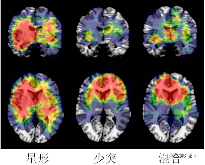 图3. 不同细胞组成的较低级别胶质瘤的位置分布特征。星形:包括弥漫性星形细胞瘤和间变性星形细胞瘤,少突:包括少突胶质细胞瘤和间变性少突胶质细胞瘤,混合:包括少突星形细胞瘤和间变性少突星形细胞瘤。