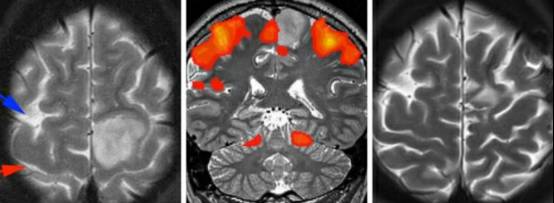 图2. 紧靠运动区前方的肿瘤需要使用运动功能区定位,确保肿瘤最大程度的安全切除。额上沟(蓝色箭头),中央沟(红色箭头)(左图)。fMRI提示位于中央小叶前部和内侧的肿瘤(中图)。术后MRI显示占位病变全切(右图)。该患者术后出现暂时性足部无力,4周后完全缓解。发生任何永久性的神经功能障碍都会削弱或消除由手术切除肿瘤带来的任何生存优势。由于肿瘤直接浸润运动功能区,有必要使用唤醒型功能区定位,术中定期检查,确保和判断肿瘤安全切除的范围。