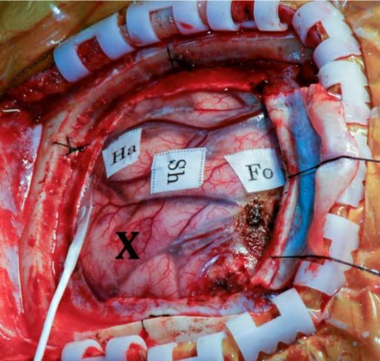 图5. 运动功能区定位。运用硬膜下条状电极检测放电部位(Ha:手;Sh:肩膀;Fo:足)。肿瘤位置标记为“X”。