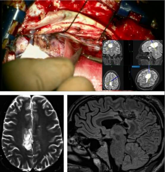 图8. 经大脑镰入路手术角度(最上图)。笔者使用脑皮层刺激定位额叶内侧至肿瘤前部功能区。使用皮层下功能区定位和经大脑镰“斜线”入路切除肿瘤。术后影像提示占位完全切除(底下图)。
