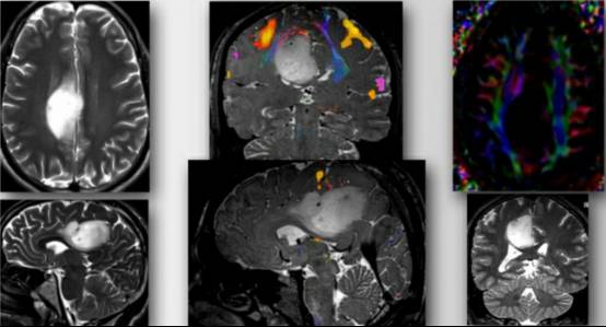 图7. 术前影像学提示为低级别胶质瘤,位于右侧脑室周围并扩展至额叶内侧。中间一列的上图(冠状位)和下图(矢状位)fMRI提示肿瘤位于感觉运动功能区。扩散张量成像(DTI)(右上图)显示肿瘤推挤运动功能纤维束移位。