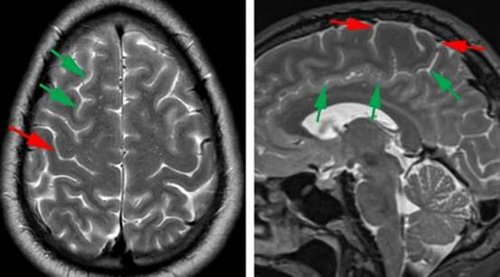 图1. 中央沟的影像学标志。源自于额上沟(绿色箭头)水平部末端向后的第二条垂直脑沟的是中央沟(红色箭头)(左图)。更多可靠的定位方法如下:先在正中矢状位MRI找到扣带沟(绿色箭头),然后向上(边缘沟)直至大脑边缘。边缘沟位于Rolandic区(中央小叶:红色箭头包绕区)后方,(右图)。