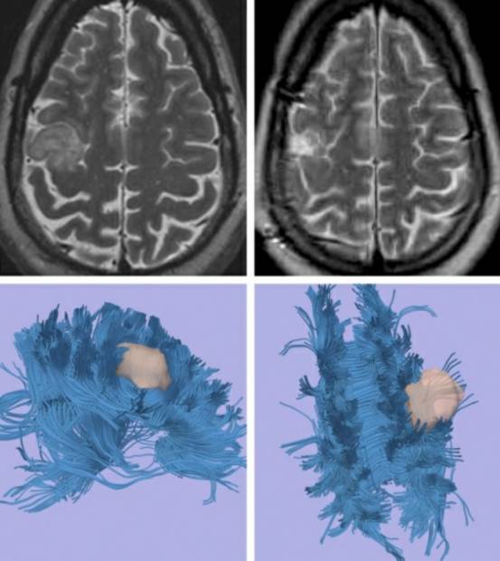 图9. 影像学提示右侧中央小叶胶质瘤(左上图)。病变位于运动功能区,考虑可能无法手术切除。然而,DTI成像(下图)提示功能区纤维束受推挤移位,提高了笔者安全切除肿瘤的信心。使用脑皮层和皮层下定位实现肿瘤全切,术后无遗留任何神经功能障碍(右上图)。
