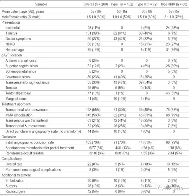 表1. 患者一般特征、dAVF部位、血管内介入治疗方法、并发症和预后等数据统计表。